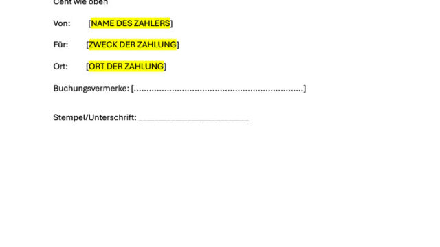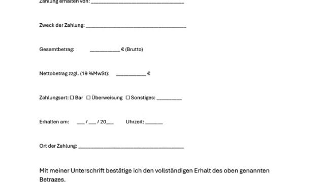 Unsere Quittungsvorlage ist so gestaltet, dass sie alle wichtigen Angaben enthält, die für eine korrekte Zahlungsbestätigung notwendig sind. Dazu gehören der vollständige Name des Zahlers, der Verwendungszweck der Zahlung, der gezahlte Betrag, die Angabe des Nettobetrags sowie der ausgewiesenen Mehrwertsteuer. Auch Ort, Datum und die Unterschrift des Zahlungsempfängers dürfen nicht fehlen. Optional können Sie zusätzlich einen Firmenstempel ergänzen, um die Quittung noch offizieller wirken zu lassen.