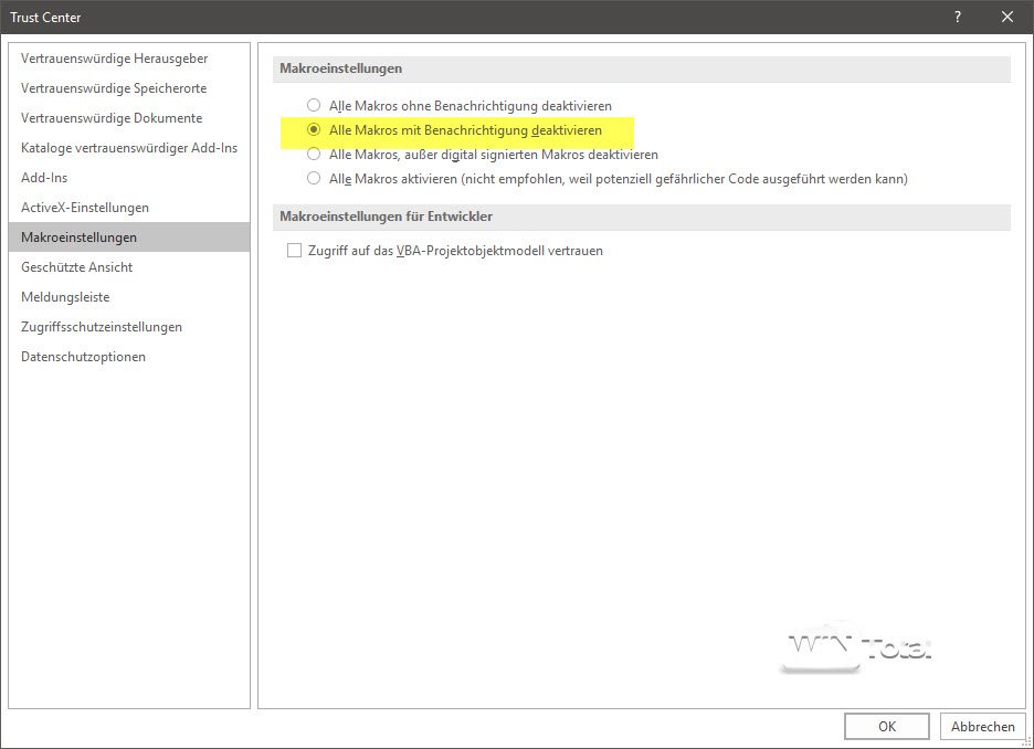 In Word 2013 oder Word 2016 finden Sie die Einstellung dazu unter Datei -> Optionen -> Einstellungen für das Trust-Center -> Makroeinstellungen.