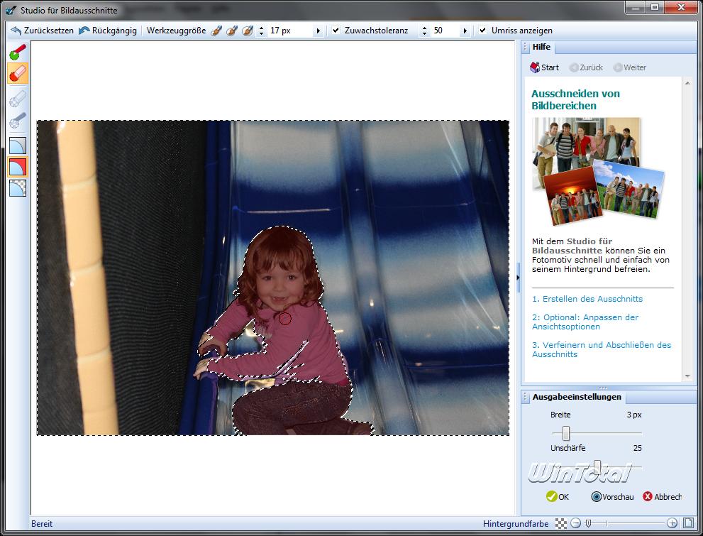 Das Freistellen von Objekten hat in den letzten Jahren einen großen Sprung nach vorne gemacht. Die Zeiten von Zauberstab und Lasso sind im Profisegment schon lange vorbei und wurden durch intelligente Kantenerkennungen verdrängt. Stattdessen bietet PhotoPlus X4 ein Studio für Bildausschnitte. Der Anwender malt mit einem Pinsel die Konturen nach, während die automatische Kantenerkennung das Objekt sehr gut freistellt.