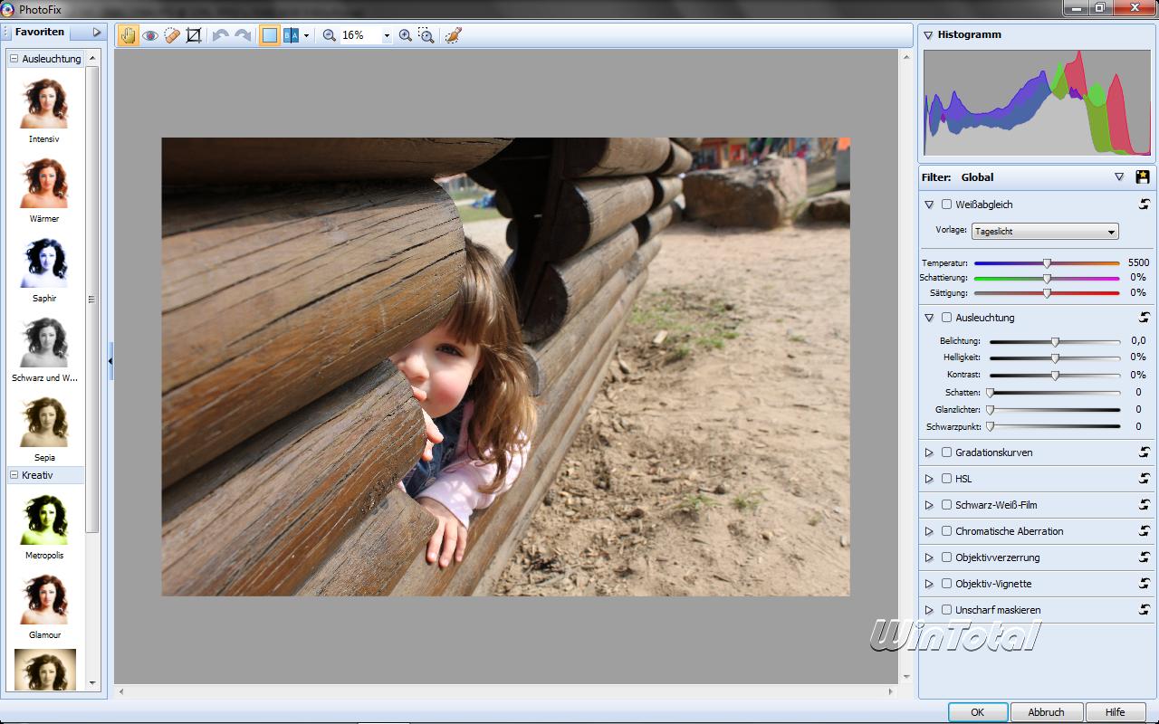 Ein Highlight von PhotoPlus X4 ist PhotoFix. Dahinter versteckt sich ein Modul zur Optimierung und Anpassung von Digitalbildern. Der Anwender kann hier sehr komfortabel verschiedene Effekte zu- oder abschalten, an Reglern die Ausleuchtung und Farbanpassung korrigieren, rote Augen und Bildfehler beheben sowie Bilder beschneiden oder begradigen. Im Gegensatz zu Programmen wie Picasa erkennt PhotoPlus X4 die roten Augen aber nicht selbstständig.