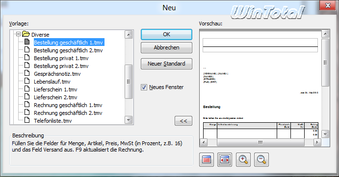 Unter „Datei/Neu“ gibt es nun eine Vorschau auf die Dokumentvorlagen mit Lupen-Funktion „größer“/“kleiner“ und Buttons für die Seitenbreite-Anzeige bzw. die Ganzseiten-Anzeige.