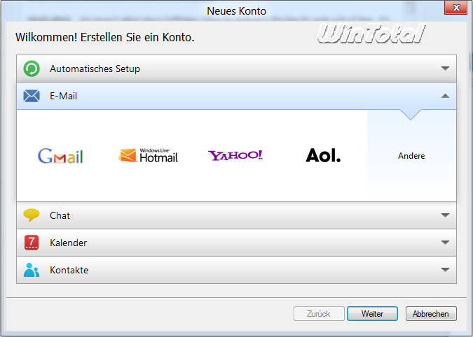 Bekannte E-Mail-Konten wie GMail, Hotmail, Yahoo! und AOL sind schon vorgegeben, sodass nur noch die E-Mail-Adresse und das Kennwort eingegeben wird (es müssen keine Serverdaten mehr eingegeben werden). Den Rest macht die „automatische Einrichtung“. Das Programm unterstützt aber alle gängigen Mailprovider.