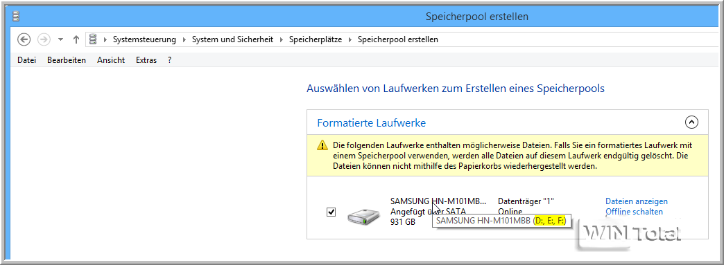 Rufen Sie dann „Neuen Pool und Speicherplatz erstellen“ auf. Es werden Ihnen alle angeschlossenen Laufwerke angezeigt, die geeignet sind. Mit „Dateien anzeigen“ können Sie sich vergewissern, welche Laufwerke es sind. In diesem Beispiel wäre es eine interne Samsung-Festplatte mit 3 Partitionen (D:, E:, F:).