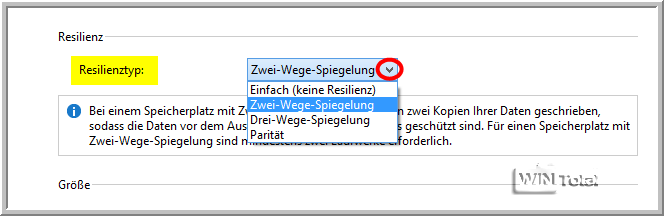 Nun kommen 4 verschiedenen Varianten zur Auswahl, die sich Resilienztyp nennen. Diese Resilienz (Spiegelung) entspricht ungefähr dem bekannten RAID-System.