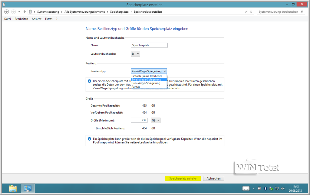 Im unteren Bereich sehen Sie vier GB-Werte. Der oberste Wert zeigt die gesamte Speicherkapazität aller Festplatten des Speicherpools. Der Wert darunter zeigt die verfügbare Kapazität, die nach Abzug der nötigen Verwaltungsdaten auf den Platten noch frei ist. Darunter (Größe Maximum) können Sie einstellen, mit welcher Kapazität der neue Speicherplatz im Explorer auftauchen soll (oder den Wert einfach so lassen). Ganz unten steht dann, wie viel der von Ihnen eingestellte Wert von Resilienztyp tatsächlich belegt. Bei einer Zwei-Wege-Spiegelung entspricht dies ungefähr der Hälfte der verfügbaren Pool-Kapazität, bei einer Drei-Wege-Spiegelung einem Drittel und bei Parität ungefähr zwei Drittel. Sobald der Platz ausgeht, erscheint eine Meldung und Sie können im Pool eine weitere Platte integrieren.