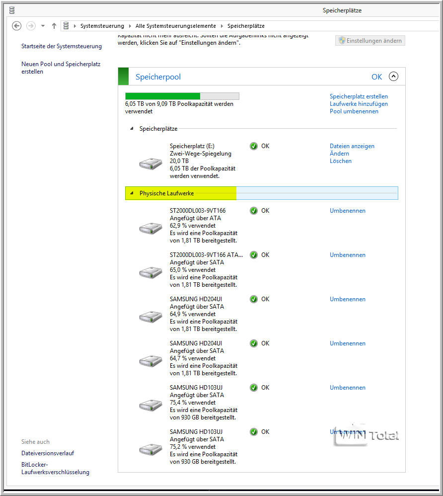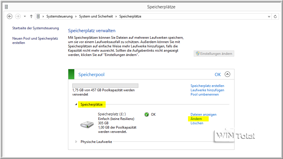 12. Die „physischen Laufwerke“ unter Speicherplätze können umbenannt werden – die Speicherplätze selbst können sehrwohl aus dem Pool gelöscht werden.