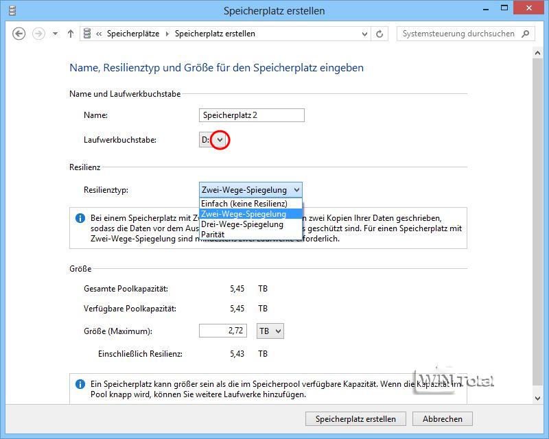 Sie können die Resilienz nachträglich nicht ändern, aber die Größe eines Speicherplatzes den Laufwerksbuchstaben und den Namen.