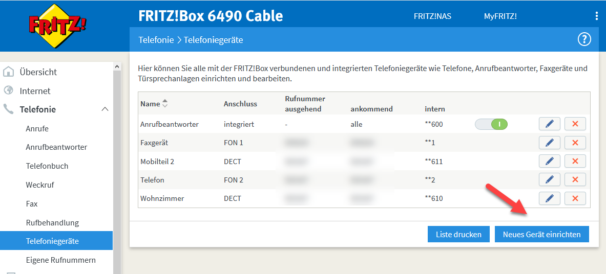 Rufen Sie zunächst im Webbrowser mit fritz.box die Oberfläche des Routers auf. Unter Telefonie -> Telefongeräte finden Sie die bisher konfigurierten Telefoniegeräte.