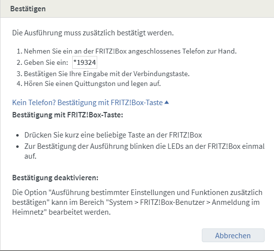 Um die Einrichtung zu bestätigen, müssen Sie dann am Telefon einen Code eingeben oder an der FRITZ!Box eine Taste zur Bestätigung drücken.