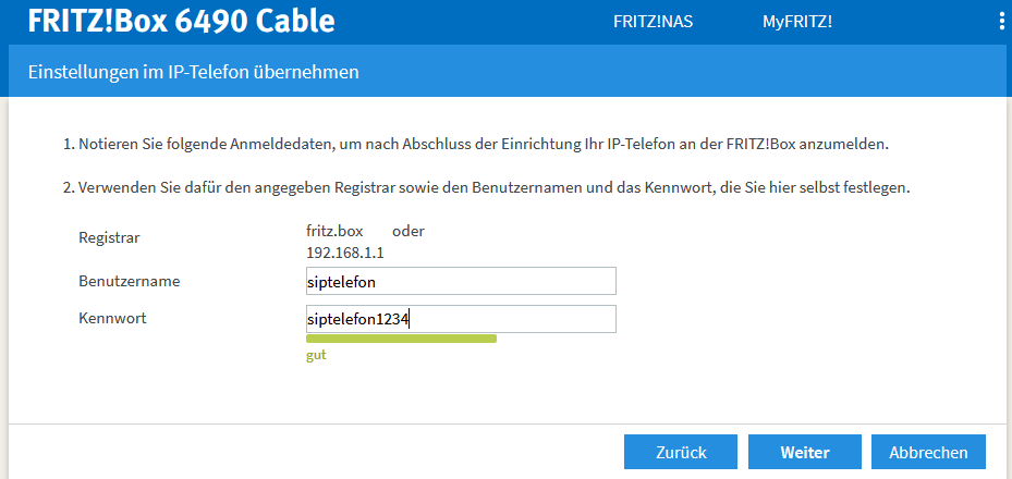Im Folgedialog müssen Sie die Zugangsdaten (Benutzername und Kennwort) des IP-Telefons von der Fritz!Box angeben.