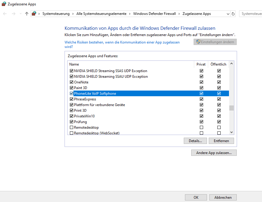 Diese Einrichtung sollte aber beim ersten Start von PhonerLite auf Nachfrage von Windows bereits eingerichtet werden. Sonst klicken Sie auf „Andere App zulassen“.
