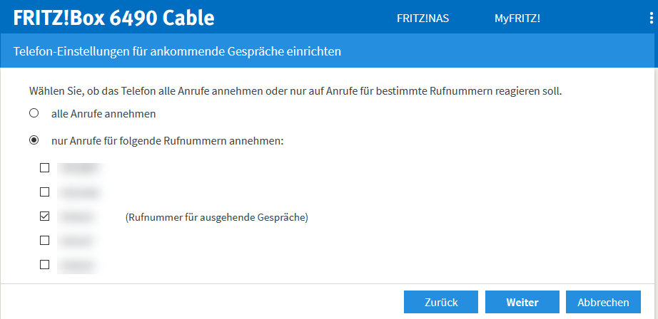 Mit dem IP-Telefon ist auch die Annahme von eingehenden Anrufen möglich, sofern die verwendete IP-Telefon-Software zu dem Zeitpunkt aktiv ist. Geben Sie daher an, für welche Rufnummern die Annahme ermöglicht werden soll (das Gerät also „klingelt“).