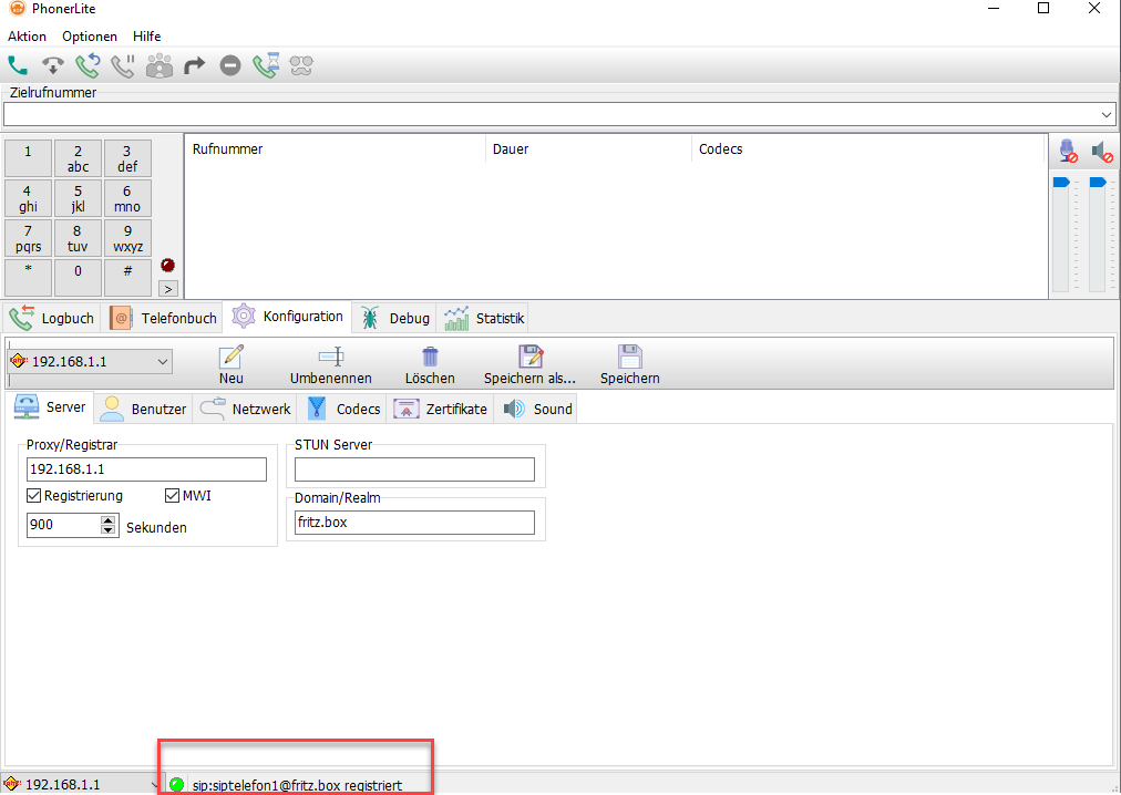 PhonerLite, FM7490 ist registriert, Status grün trotzdem keine Telefonie möglich.