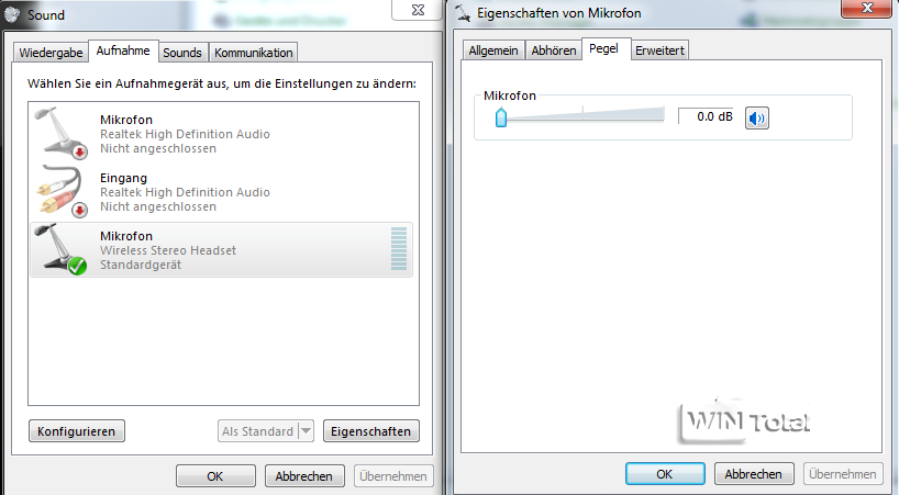 Passen Sie noch die Pegellautstärke für das Headset in Windows an. Wir können hier keine detaillierte Anleitung bereitstellen, da neben den Dialogen von Windows auch viele Soundtreiber eigene Regler und Einstellungen bieten. Wichtig ist, dass die die Aufnahmelautstärke so gewählt wird, dass die Stimme ausreichend laut, aber nicht verzerrt ist.