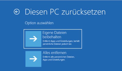 Mit dieser Funktion führt Windows 10 eine Reparaturinstallation durch. Programme und Einstellungen gehen dabei verloren. Eigene Dateien können Sie dagegen behalten, wenn Sie die entsprechende Option auswählen.