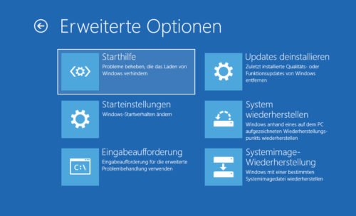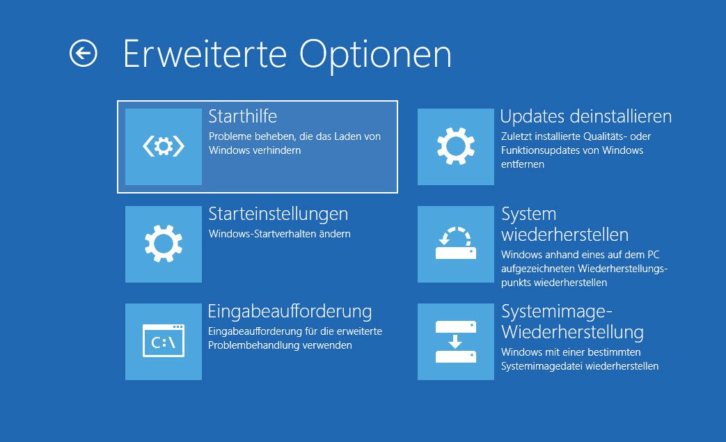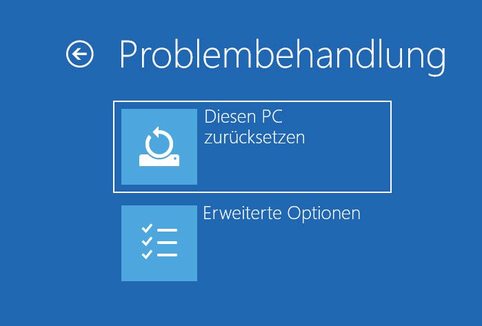 In den erweiterten Startoptionen finden Sie den Punkt „Problembehandlung“, welchen wir für verschiedene Reparaturversuche benötigen.