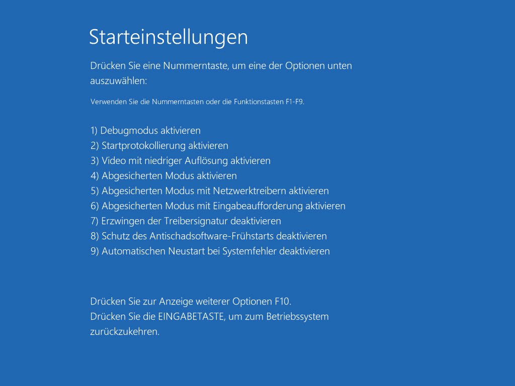 Da alle notwendigen Eingriffe ohne ein lauffähiges Windows vorgenommen werden müssen, benötigen Sie die erweiterten Startoptionen von Windows, auch als abgesicherter Modus bezeichnet. Diesen erreichen Sie bei Windows 8.x und Windows 10 beim Starten über die Tastenkombination STRG+F8.