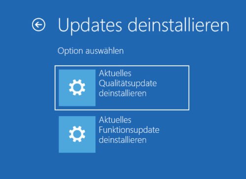 Sie haben hinter dem Punkt „Updates deinstallieren“ dann die Auswahl, das zuletzt installierte Funktions-Update oder Qualitäts-Update zu deinstallieren. Der Unterschied besteht darin, dass Qualitäts-Updates Fehler beheben, während Funktions-Updates neue Features und Funktionen in Windows einspielen.