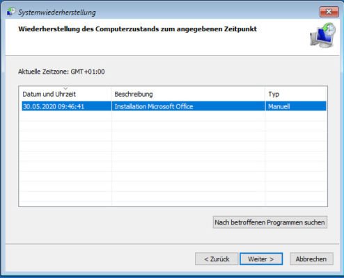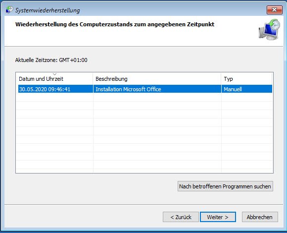 Windows bietet Ihnen dann eine Auswahl verschiedener Systemwiederherstellungspunkte, sofern die Funktion „Systemwiederherstellung“ in der Systemsteuerung -> System -> Computerschutz zuvor aktiviert war und Windows automatisch oder Sie manuell einen Wiederherstellungspunkt angelegt haben.