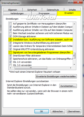 Unter der Registerkarte „Erweitert“ könnten Sie die Option „Signaturen von heruntergeladenen Programmen überprüfen“ deaktivieren und