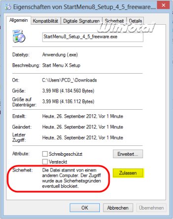 Rufen Sie bei der heruntergeladenen Datei mit Rechtsklick die „Eigenschaften“ auf und klicken Sie auf der Registerkarte „Allgemein“ die Schaltfläche „Zulassen“ an. Danach wird der Sicherheitshinweis „Die Datei stammt von einem anderen Computer. Der Zugriff wurde aus Sicherheitsgründen eventuell blockiert“ ausgeblendet.