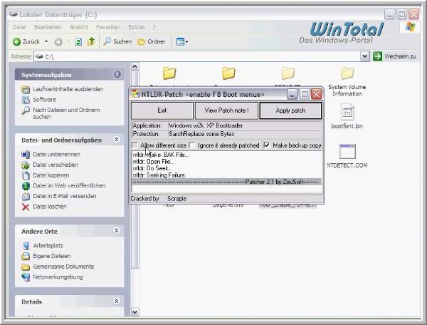 - Das Patch ntldr_Enable_F8-Menue.exe (5 KB, gezippt) unbedingt direkt in „C:\“ entpacken und von hier aus die Exe starten. Andere Verzeichnisse funktionieren leider nicht. Unbedingt vorher ein Image anlegen.
