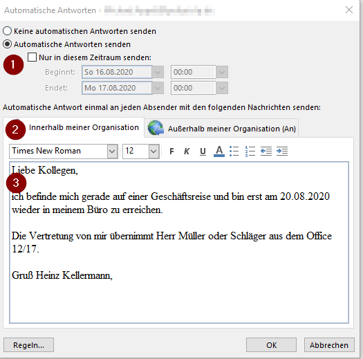 Sie können im oberen Bereich (1) auswählen, ob Sie immer automatische Antworten senden möchten oder nur für einen bestimmten Zeitraum. Über die beiden Registerkarten (2) bietet Outlook Ihnen zwei unterschiedliche Abwesenheitstexte, abhängig davon, ob es sich bei dem Absender um einen Mitarbeiter aus Ihrer Organisation handelt oder nicht. Dies ist sehr praktisch, da für Kontakte außerhalb der Organisation dann eine andere Vorlage verwendet werden kann.