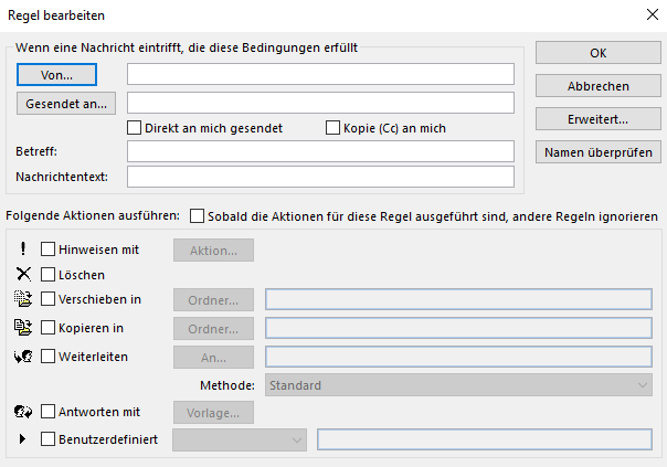 Klicken Sie auf „Regel hinzufügen“, um das Fenster für die Regelbearbeitung zu öffnen. Sie können hier viele Einstellungen vornehmen, beispielsweise im Feld „Von“ bestimmte Absender eintragen, Filter wie „Direkt an mich gesendet“ festlegen oder einen Text im Betreff oder in der Nachricht als Kriterium festlegen. Darunter haben Sie dann die Möglichkeit, verschieden Aktionen auszuführen.
