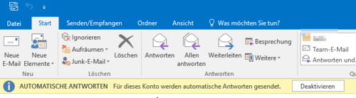 Wenn Sie eine Abwesenheitsnotiz aktiviert haben, erkennen Sie dies an einem Hinweis unterhalb des Menübands von Outlook.