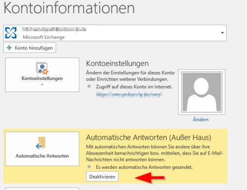Über den Button „Deaktivieren“ können Sie das automatische Antworten abschalten. In den Kontoinformationen haben Sie auch die Möglichkeit, den Abwesenheitsassistent zu deaktivieren.