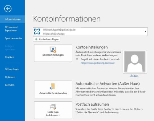 Um eine Abwesenheitsnotiz einzurichten, wechseln Sie in Outlook in den Abschnitt „Datei“. Unterhalb von „Kontoinformationen“ können Sie das Konto auswählen, für welches Sie eine Abwesenheitsnotiz einrichten möchten. Klicken Sie dann bei den Kontoinformationen auf „Automatisches Antworten“.