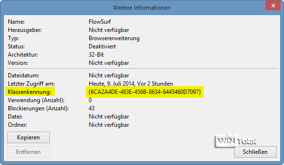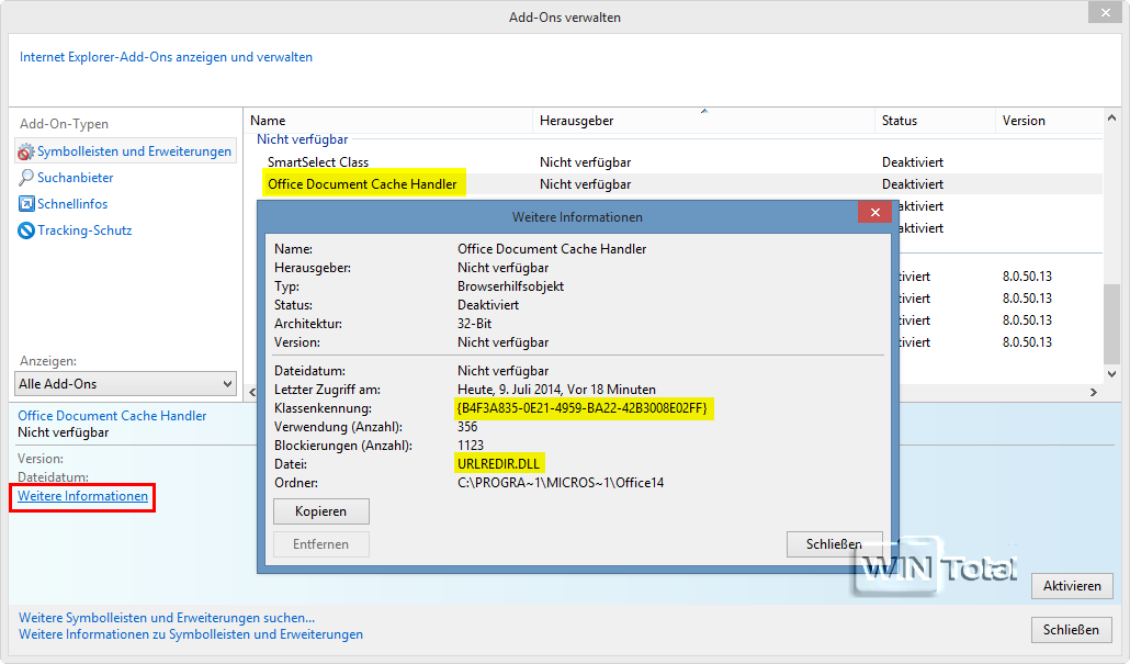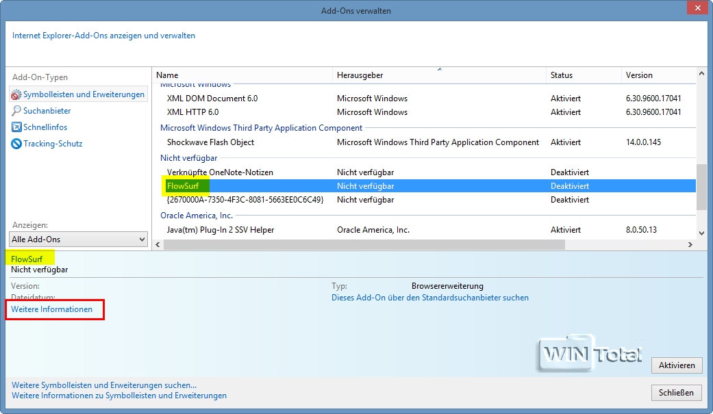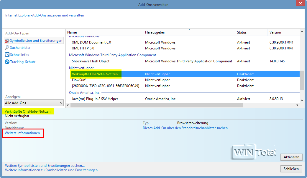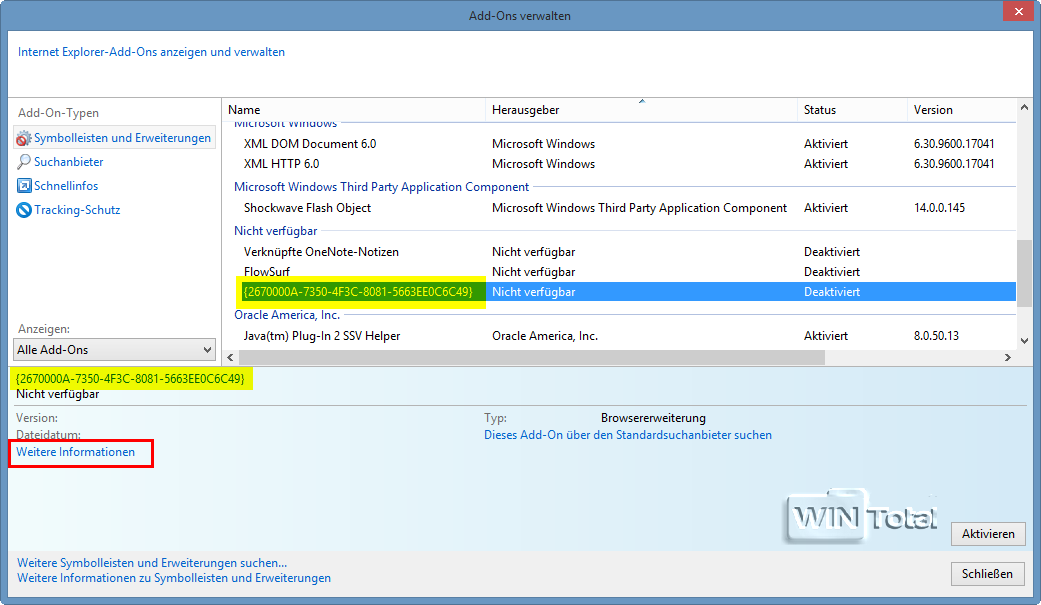 Wenn sie ein Add-On anklicken, finden Sie unter „Weitere Informationen“ den Pfad und die genaue Bezeichnung des Add-Ons, das Sie im Pfad löschen können, wenn es nicht unter „Programme und Features“ bzw. „Programme und Funktionen“ zu finden ist.