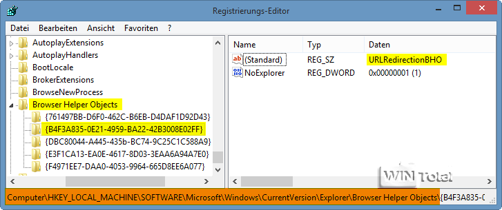 HKEY_LOCAL_MACHINE\Software\Microsoft\Windows\CurrentVersion\Explorer\Browser Helper Objects