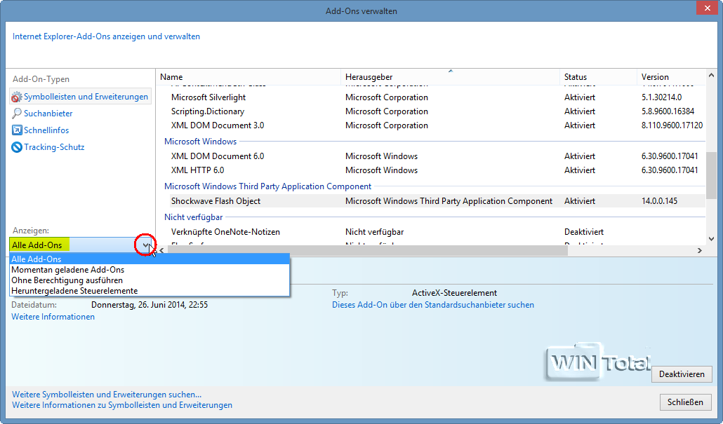 Add-Ons finden Sie unter „Extras“ – „Add-Ons verwalten„. Sie sind kategorisiert nach Name und Herausgeber, z.B. Adobe System, Microsoft Corporation, Microsoft Windows, Oracle America, „Nicht verfügbar„. Damit alle Add-Ons sichtbar werden, klicken Sie von „Momentan geladene Add-Ons“ auf „Alle Add-Ons„. „Nicht verfügbar“ sind Rückstände von gelöschten Programmen.