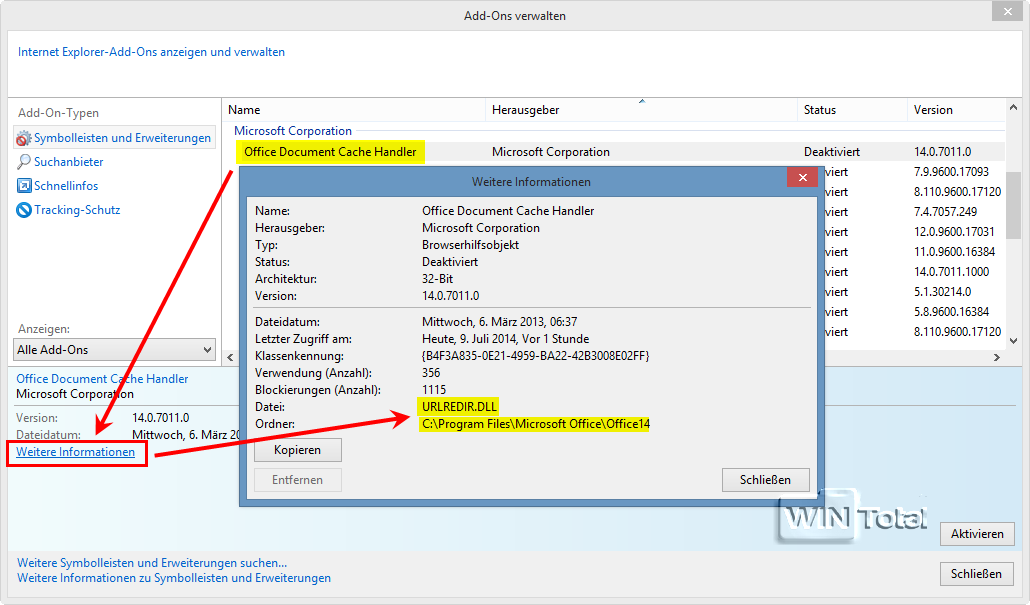 Wenn Sie sich nicht sicher sind, ob es sich wirklich um den Add-On-Eintrag handelt, benennen Sie den Eintrag erst einmal um, z.B. in URLREDIR.dll.old.