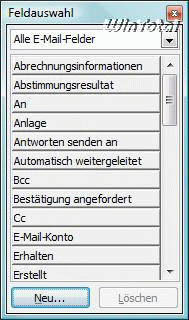 Wenn die Aktivitäten-Liste mehr Details als die Betreffzeile und den Ordner enthalten soll, klickt man mit der rechten Maustaste auf eine der Spaltenüberschriften. Im Kontextmenü den Befehl „Feldauswahl“ aufrufen. Aus dem daraufhin angezeigten Fenster den oder die Feldnamen einfach neben eine der Spaltenüberschriften der Aktivitäten-Liste (zwei kleine rote Pfeile) ziehen. Die auf diese Weise eingefügten Spalten werden beim Drucken im Tabellenformat ebenfalls ausgegeben.