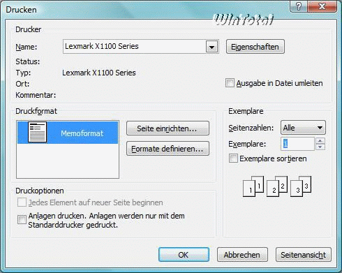 Die Registerkarte „Aktivitäten“ zeigt eine Liste mit allen Outlook-Elementen an. Outlook bietet aber beim Drucken über »Datei – Drucken« nur das Memoformat an, in dem auch nur Informationen zum aktuellen Kontakt und nicht zu den „Aktivitäten“ erscheinen.