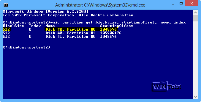 (als Administrator in der Kommandozeile ausgeführt) erhalten Sie eine Auflistung der Partitionen mit der Blockgröße und dem StartingOffset.