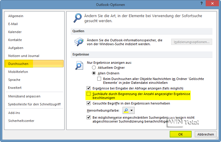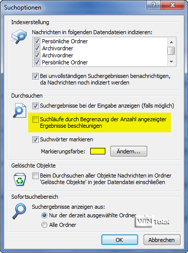 Outlook 2013 zeigt beim Einsatz der Sofortsuche standardmäßig nur die ersten 30 Ergebnisse an, Outlook 2010/2007 die ersten 200. Sollen sofort mehr als diese angezeigt werden, schalten Sie die nachfolgende Option ab.