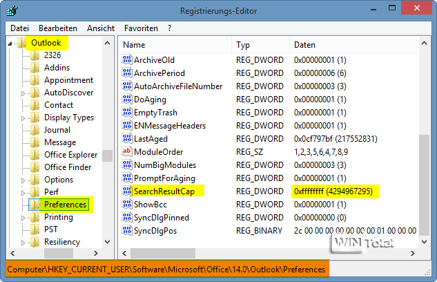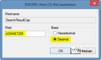 3.) Hat der „SearchResultCap“-Eintrag einen anderen Wert, liefert Outlook maximal genau diese Anzahl an Ergebnissen – z.B. 4294967295 (in Dezimal).