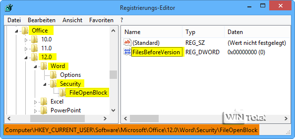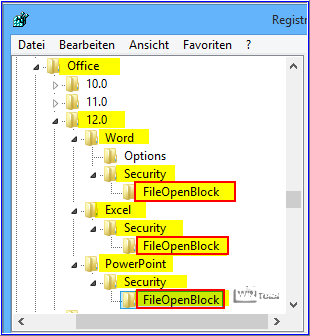 Falls die Unterschlüssel „FileOpenBlock“ bei den Anwendungen vorhanden sind, schauen Sie im rechten Fenster nach folgenden Einträgen und ändern Sie die Werte.