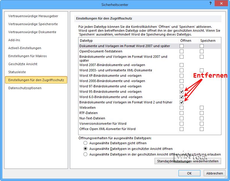 Auch hier handeln Sie sich mit der neuen Einstellung eine Sicherheitslücke ein, da die alten Dokumenttypen anfälliger für Makroviren sind.