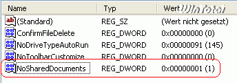 einen neuen DWORD-Wert anlegen mit dem Namen NoSharedDocuments und den Wert von 0 auf 1 ändern.