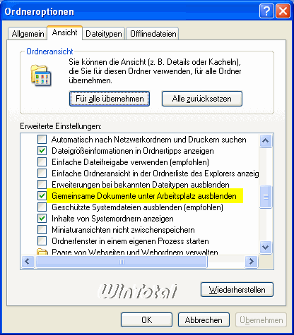 Hier kann dann der Ordner „Gemeinsame Dokumente“ im ARBEITSPLATZ ein- oder ausgeblendet werden in den „Ordneroptionen – Ansicht“.