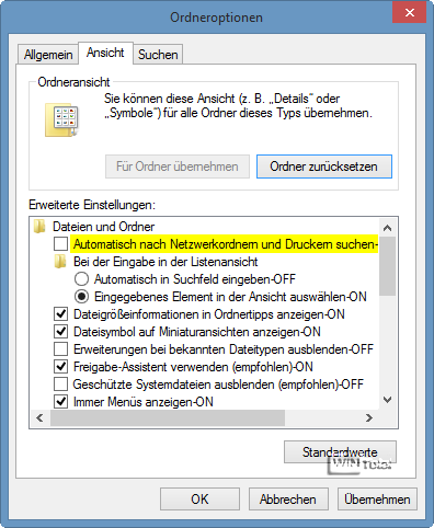 „Automatisch nach Netzwerkordnern und Druckern suchen“ kann unter Vista, Windows 7 und Windows 8 nur in der Registry geändert werden und nicht mehr wie unter Windows XP-Zeiten in den „Ordneroptionen“.