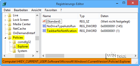müssen Sie einen neuen DWORD-Wert „TaskbarNoNotification“ mit dem Wert 1 erstellen zum Ausblenden der Infos.