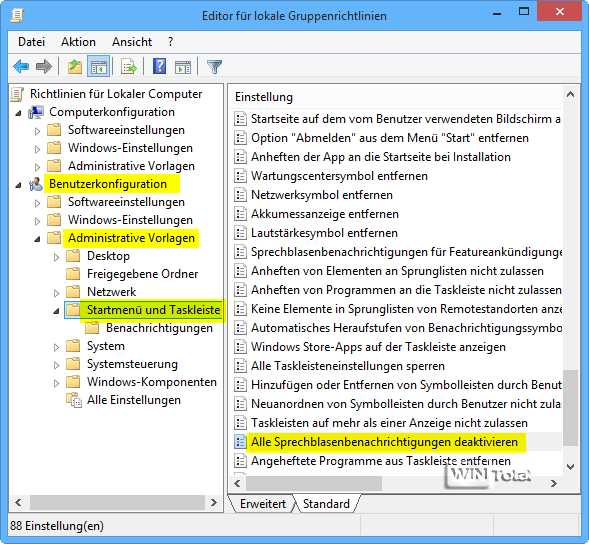 Über Start – Ausführen: gpedit.msc öffnen Sie die Gruppenrichtlinie. Unter Benutzerkonfigurationen – Administrative Vorlagen – Startmenü und Taskleiste – „Alle Sprechblasenbenachrichtigungen deaktivieren“ – müssen Sie die Option von „Nicht konfiguriert“ auf „Aktiviert“ setzen. Die Einstellung ist sofort wirksam.