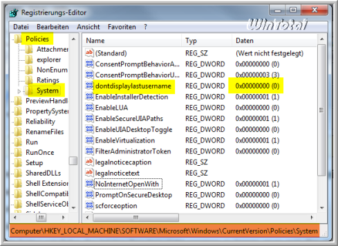 ob auch dort der Eintrag DontDisplayLastUserName vorhanden ist. Steht dieser auf »0«, kann man diesen auf 1 setzen. Um den Eintrag zu ändern, müssen Sie die Registry als Administrator ausführen.