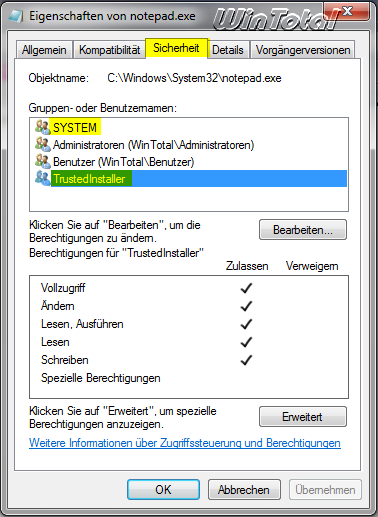 notepad.exe – TrustedInstaller hat Vollzugriff