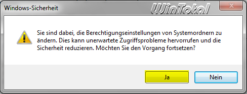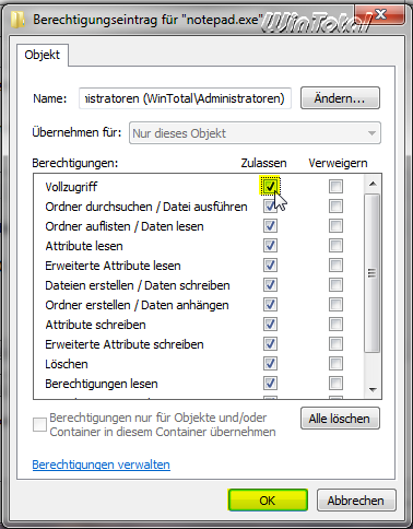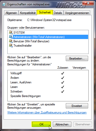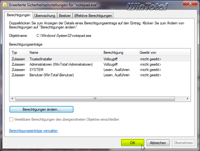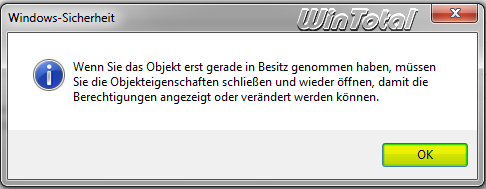 Nachdem Sie auf „Ja“ geklickt haben erscheint wieder die Registerkarte „Berechtigungen„, klicken Sie hier nur auf [OK].